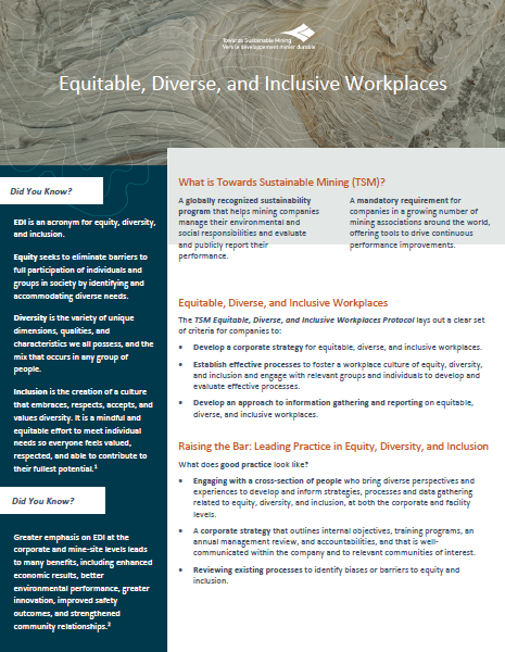 In June 2023, MAC members adopted a new TSM Equitable, Diverse, and Inclusive Workplaces Protocol—the mining sector’s first comprehensive standard to support continual improvement towards these objectives.